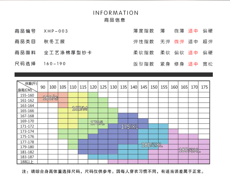 155(S)、165(M)、170(L)、175(XL)、180(XXL)、185(XXL)