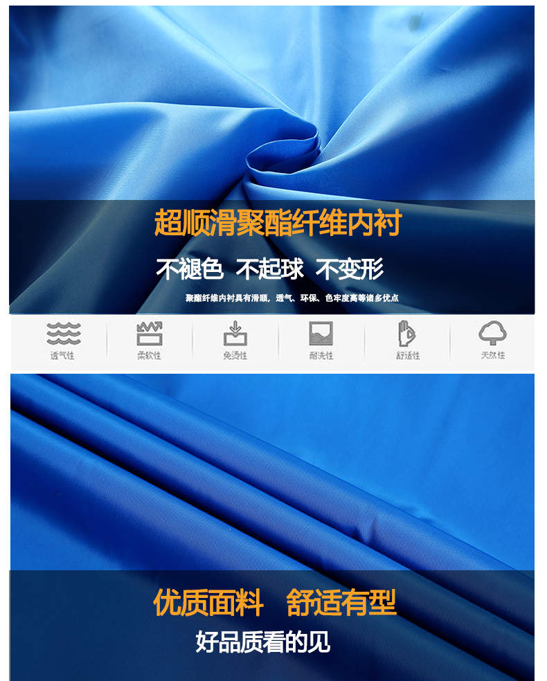 采用超順滑聚酯纖維內襯,不起球,不褪色,不變形。防靜電內襯,為冬天起到更實用的穿著